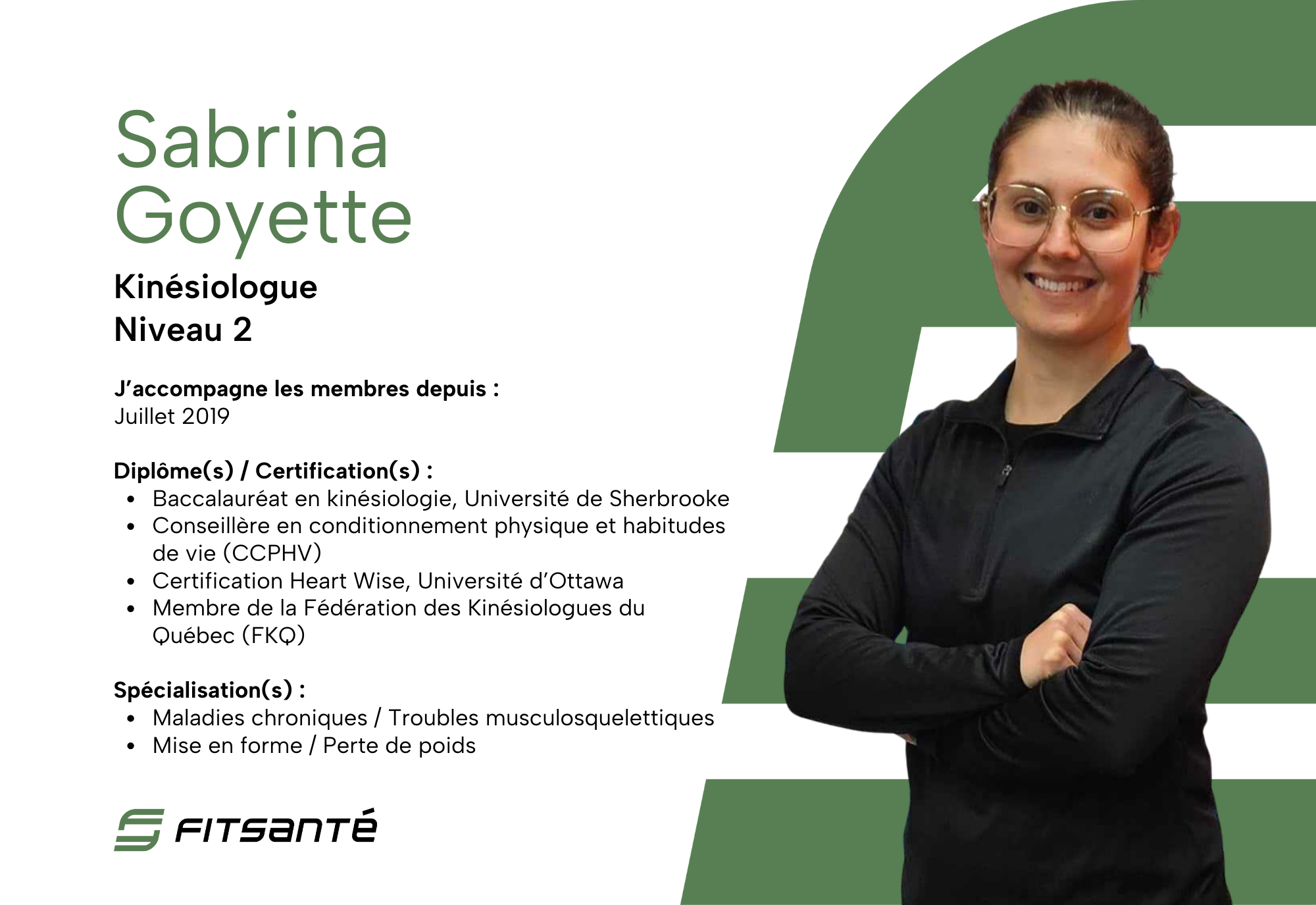 Dans l'équipe depuis plus de 5 ans, Sabrina est notre chef d'orchestre pour tout ce qui est cours de groupe au centre, de la gestion de l'horaire à la création de nouveau contenu en plus dêtre kinésiologue.
